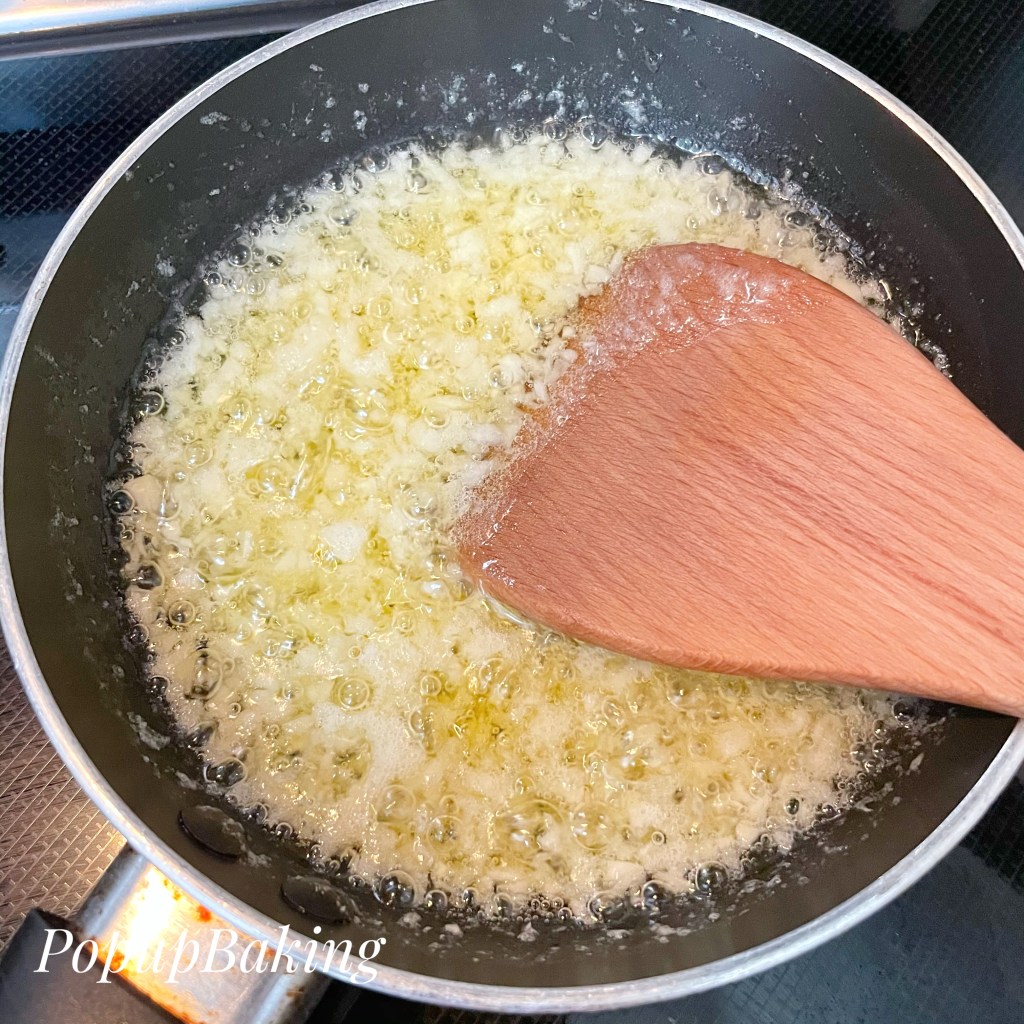 4/ Trong lúc đợi bột nở thì đi làm sốt bơ tỏi. Cách làm cực kì đơn giản. Đun bơ chảy trên chảo, cho phần tỏi băm nhuyễn và muối vào để sôi tầm 2-3 phút, thi thoảng đảo đều là được. Để nguội rồi cho vào tủ lạnh đến khi dùng.