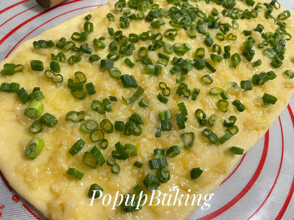 6/ Phết phần sốt bơ tỏi lên khắp miếng bột, rắc đều hành lá, dùng tay ấn nhẹ để hành bám vào mặt bột hơn. Dùng con dao sắc cắt bột thành từng miếng nhỏ, mình cắt thành 12 miếng. Xếp lần lượt vào khuôn, chừa tí khoảng cách để bột nở sau này. Lưu ý nên chống dính khuôn bằng bơ trước khi cho bột vào (nếu sử dụng loại không chống dính).