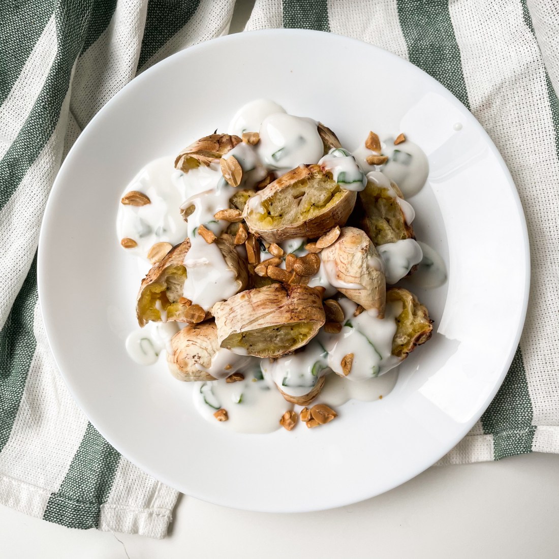 5/ Chuối nướng xong cắt thành miếng vừa ăn, cho phần nước dừa lên mặt và rắc đậu phộng lên là hoàn thành. Món này ngon nhất là khi ăn nóng, chuối cực kì dẻo và thơm, hoà cùng nước cốt dừa phải gọi là “đỉnh của chóp”. 😆