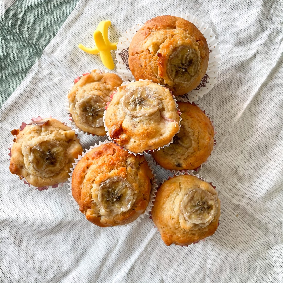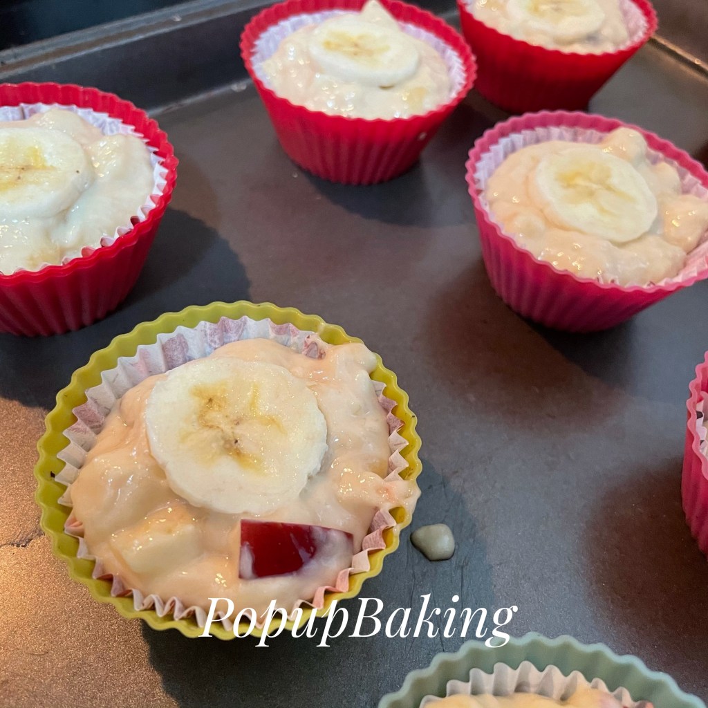 5/ Chia hỗn hợp vào khuôn (chỉ tầm 3/4 khuôn, không đổ quá đầy vì bánh sẽ nở thêm trong lúc nướng). Bột sau khi trộn thì nên đem đi nướng nhanh nhất có thể để bánh nở tốt nhất. Hôm đấy mình hơi “ngựa” một tí nên xếp thêm lát chuối lên mặt, 😛 bạn cũng có thể để thêm hạt, trái cây để trang trí nha.