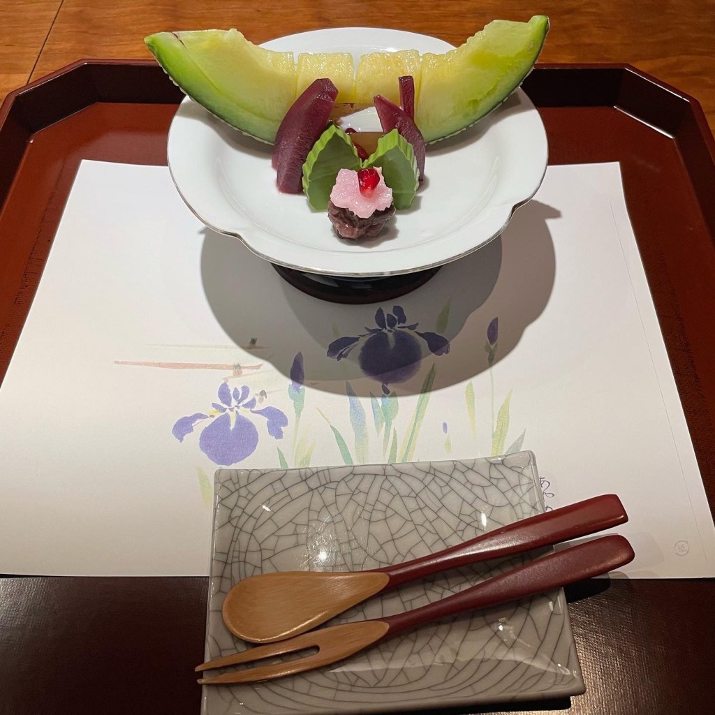 Món tráng miệng bao gồm dưa lưới Nhật (Shizuoka Musk Melon) cực kì nổi tiếng, đào ngâm rượu đỏ, rau câu dâu tươi + sữa đặc, mousse trà xanh, đậu đỏ + bánh gạo Nhật + hạt lựu. Một cách không thể tuyệt vời hơn để kết thúc bữa ăn.