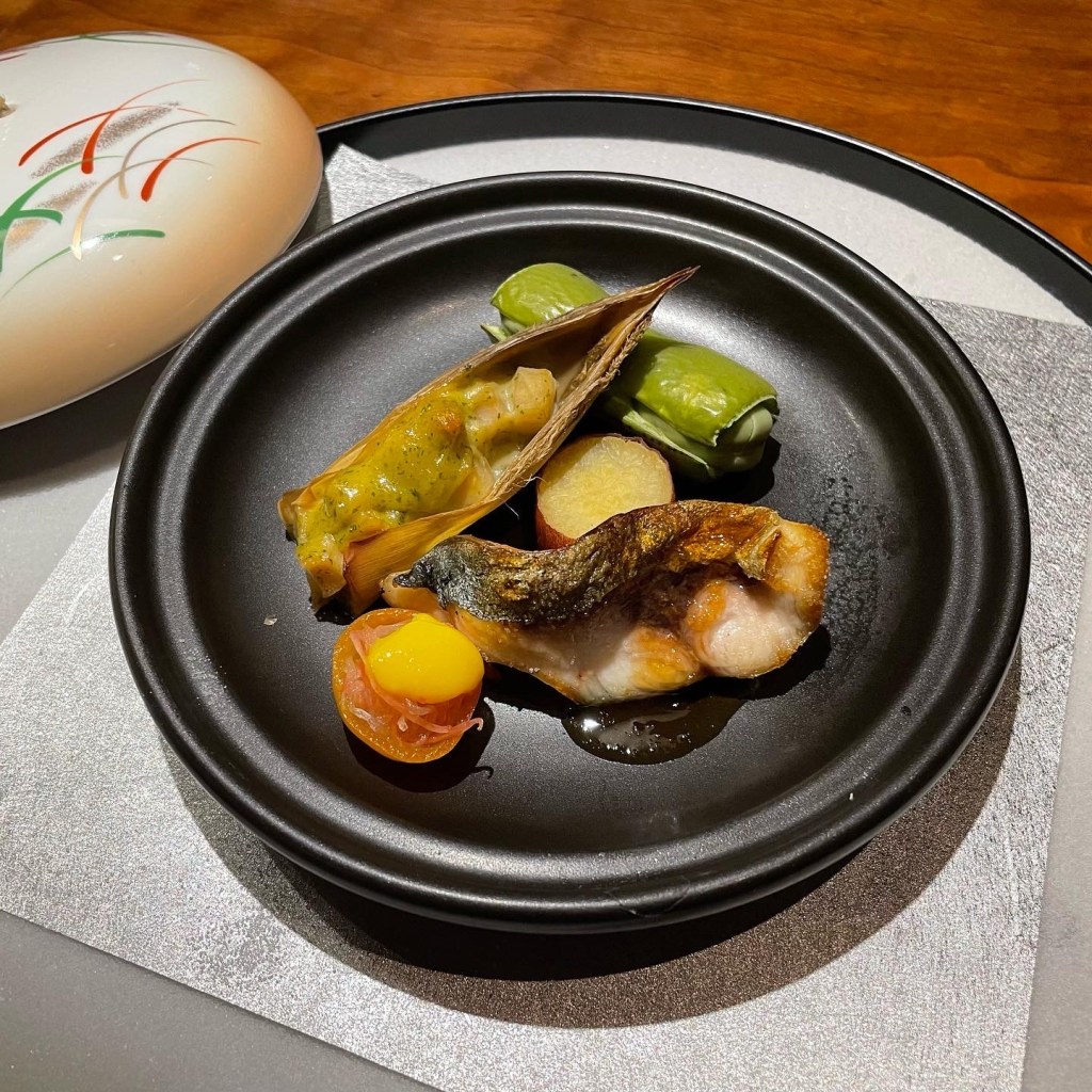 Cá nướng + đậu + măng sốt miso + khoai lang. Ngoài ra, phần vỏ tắc cùng củ cải và sốt chanh vàng có vị chua ngọt, khác hẳn với những món còn lại với mục đích tráng miệng trước khi qua món mới (sunomono)