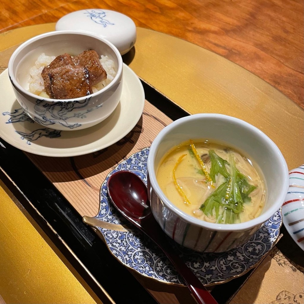 Món trứng hầm cùng nấm, gà, và rau củ (Chawanmushi) cùng cơm và thịt bò Wagyu.