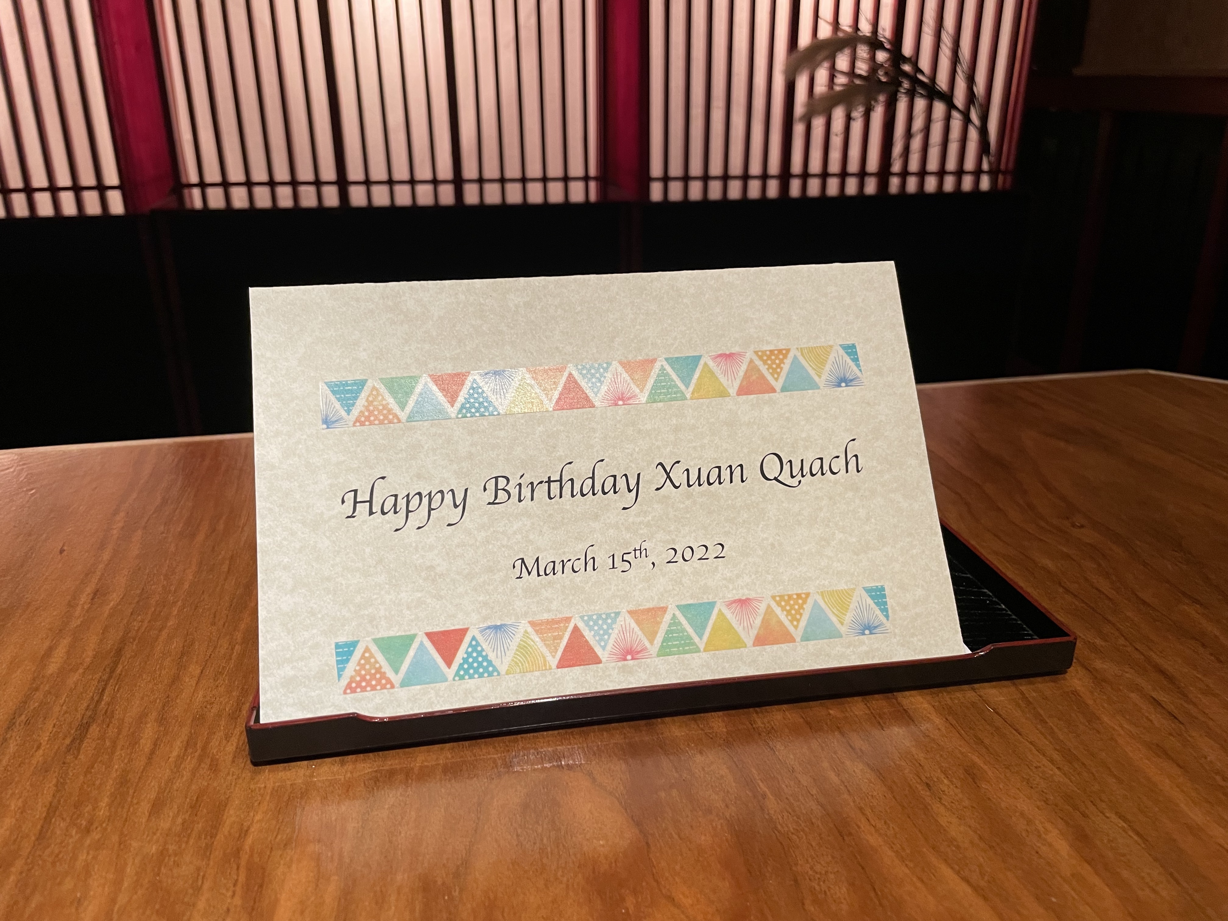Xuyên suốt bữa ăn mình được giới thiệu nguyên liệu từng món, nguồn gốc, ý nghĩa phía sau của chúng. Từng món nhỏ đều có vị đặc trưng riêng biệt, không lẫn vào nhau nhưng khi ăn cùng thì có sự kết hợp cực kì hài hoà. Thực sự ngoài vị ra thì mình rất ấn tượng với mùi thơm của chúng. Các món thường sẽ có nắp đậy, lúc mở ra thì mùi hương toả ra ngào ngạt, một cảm giác sướng không tả được. Và không thể không nhắc đến cách trang trí tinh tế của từng món ăn. Ngồi trong không gian đấy và thưởng thức những món ăn này làm mình cảm thấy trân trọng hơn từng chi tiết, hương vị mà người đầu bếp muốn gửi gắm đến thực khách. À, mình còn nhận được thiệp chúc mừng sinh nhật từ bác đầu bếp và chụp hình cùng bác nữa.